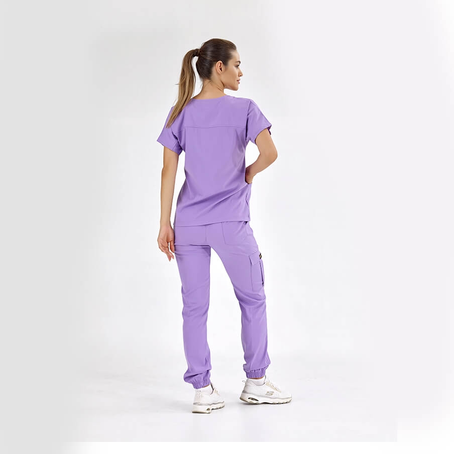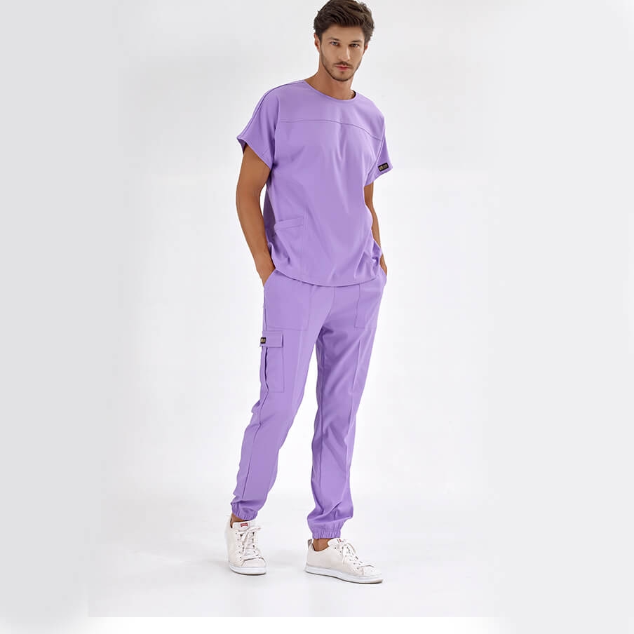 Lila Basic Doktor Hemşire Medikal Scrubs Takım Lüks Likralı Kumaş, sağlık çalışanlarının rahatlığı ve şıklığı için tasarlanmış bisiklet yaka ve jogger pantolonlu cerrahi takımdır. Spor dikişleri ve kargo cep detayıyla fonksiyonel kullanım sağlar.