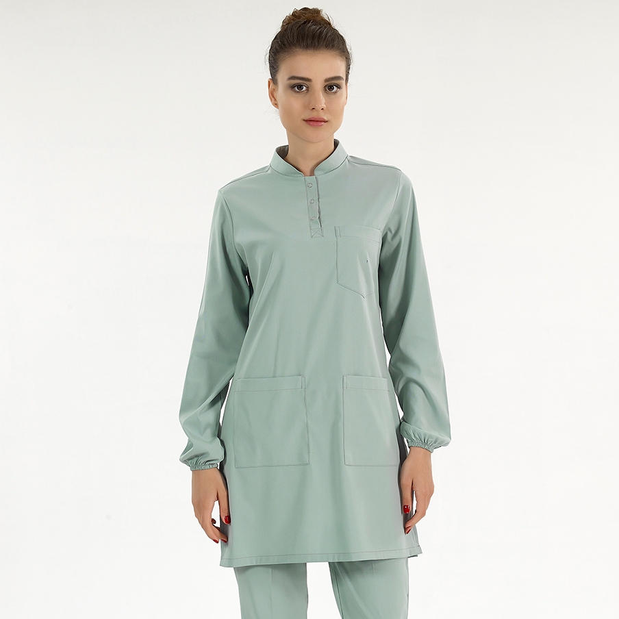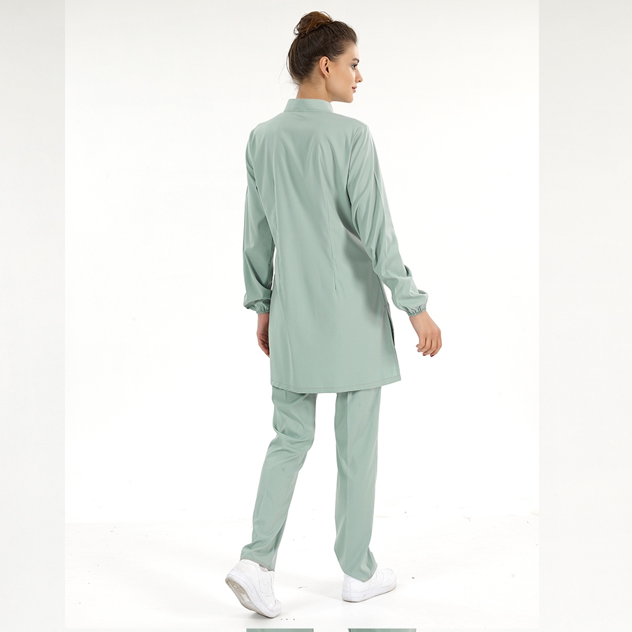 Mint Yeşili Tesettür Hakim Yaka Doktor Hemşire Medikal Scrubs Takım Lüks Likralı Kumaş, tesettürlü sağlık personelleri için özel olarak tasarlanmıştır. Uzun kollu yapısı ve normal cerrahi takımlardan 12 cm daha uzun etek boyu ile tesettür giyim standartlarına uygundur.
