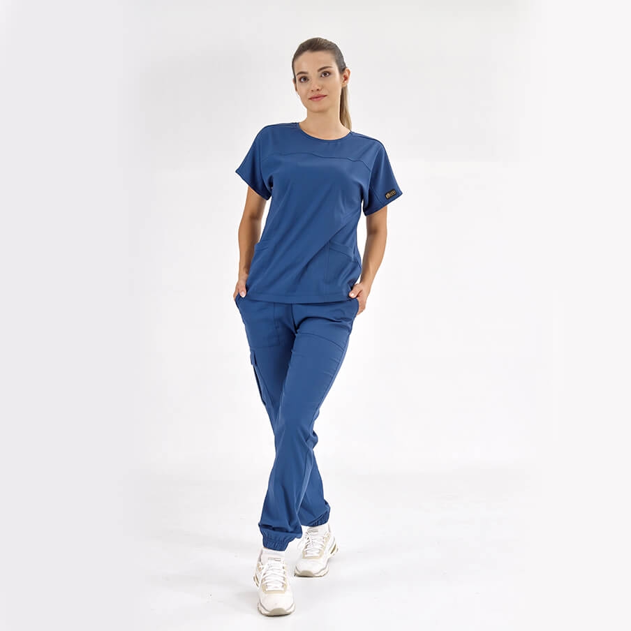 Petrol Mavisi Basic Doktor Hemşire Medikal Scrubs Takım Lüks Likralı Kumaş, sağlık çalışanlarının rahatlığı ve şıklığı için tasarlanmış bisiklet yaka ve jogger pantolonlu cerrahi takımdır. Spor dikişleri ve kargo cep detayıyla fonksiyonel kullanım sağlar.