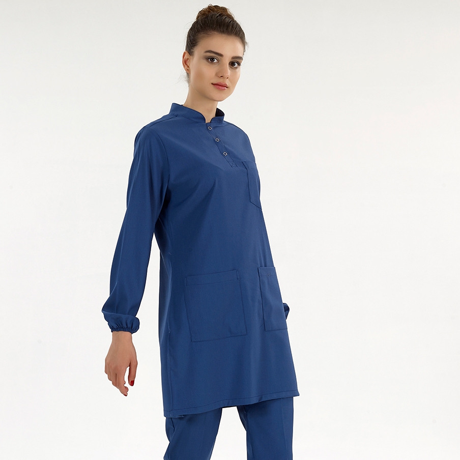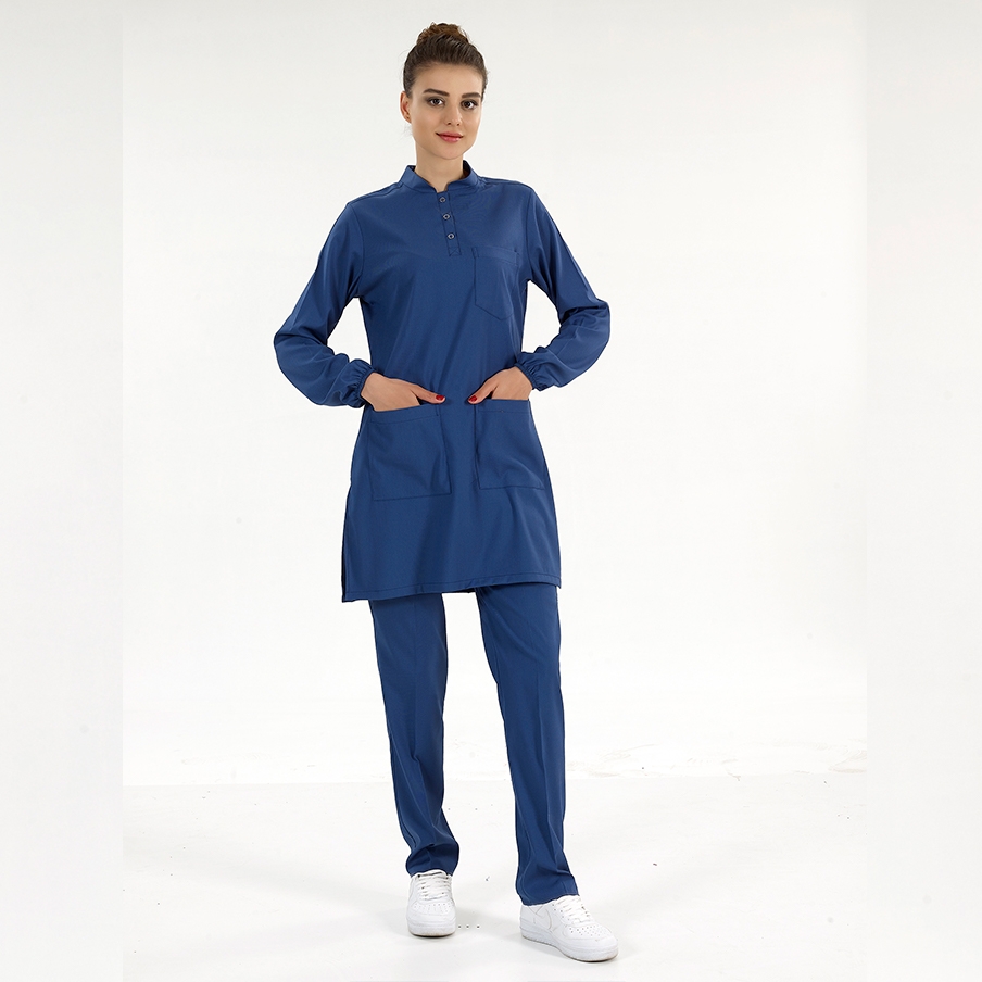 Petrol Mavisi Tesettür Hakim Yaka Doktor Hemşire Medikal Scrubs Takım Lüks Likralı Kumaş, tesettürlü sağlık personelleri için özel olarak tasarlanmıştır. Uzun kollu yapısı ve normal cerrahi takımlardan 12 cm daha uzun etek boyu ile tesettür giyim standartlarına uygundur.