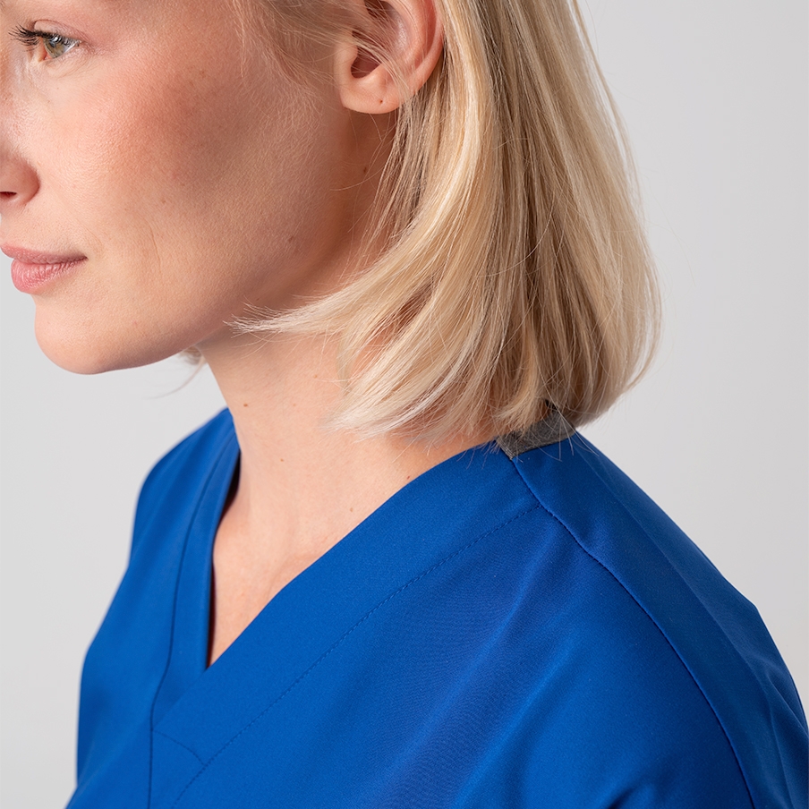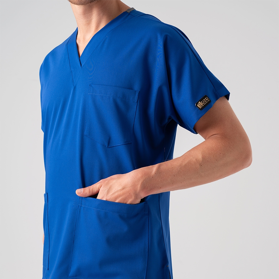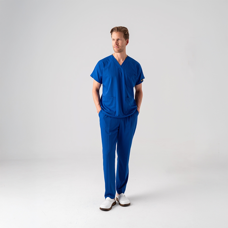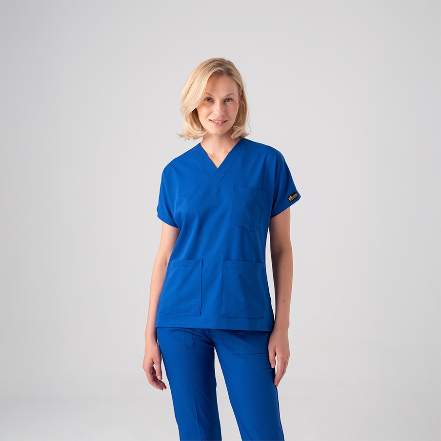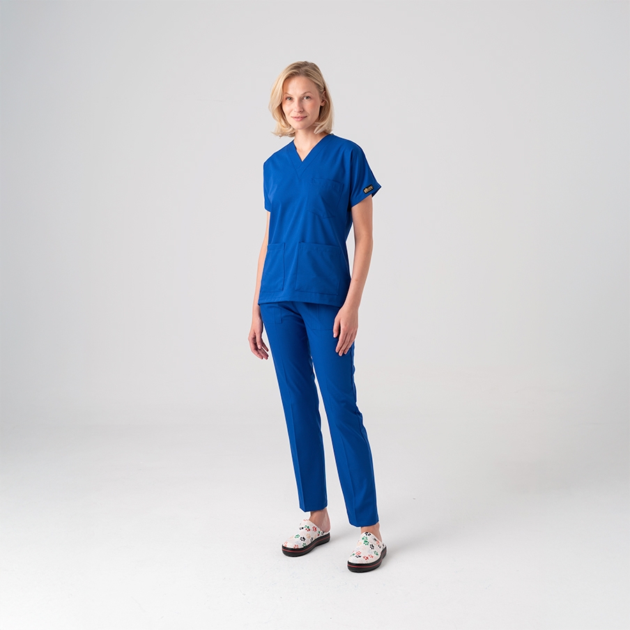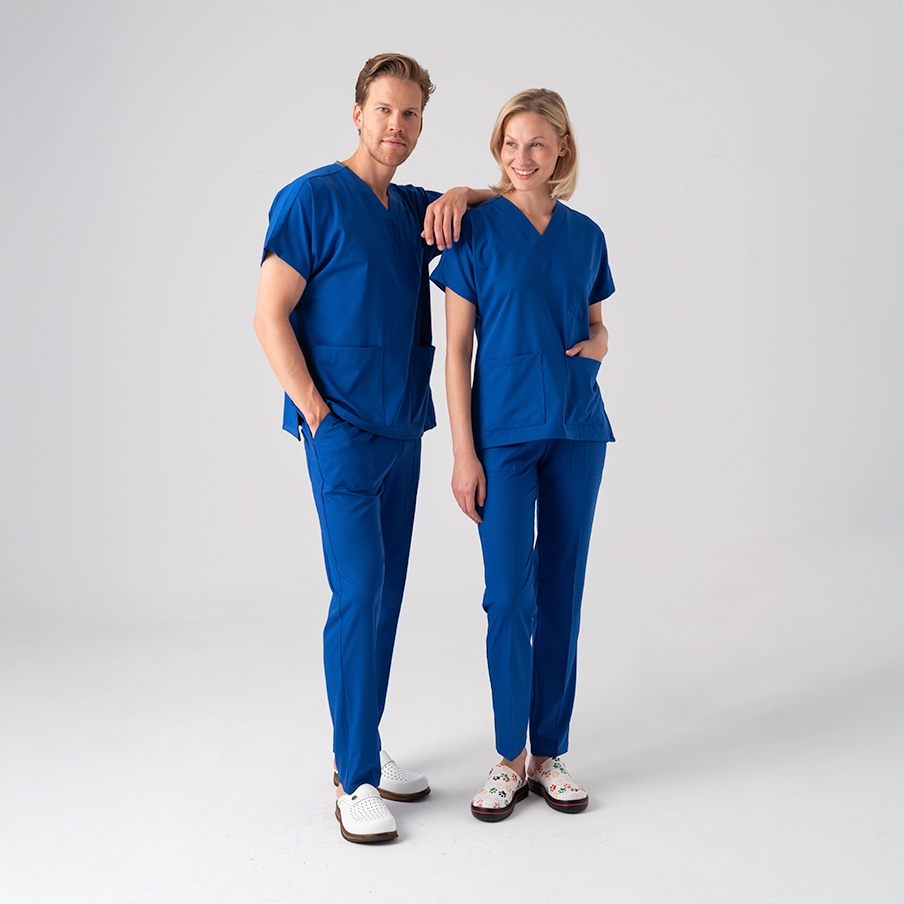 Royal Blue Dr. Greys Doctor Nurse Medical Scrubs Set Best Lycra Fabric is a surgical scrub set specially designed for the comfort of healthcare professionals. It consists of a V-neck, batwing sleeve top and elastic waist pants. It is suitable for intense work tempos with its non-sweating fabric structure and functional pockets.