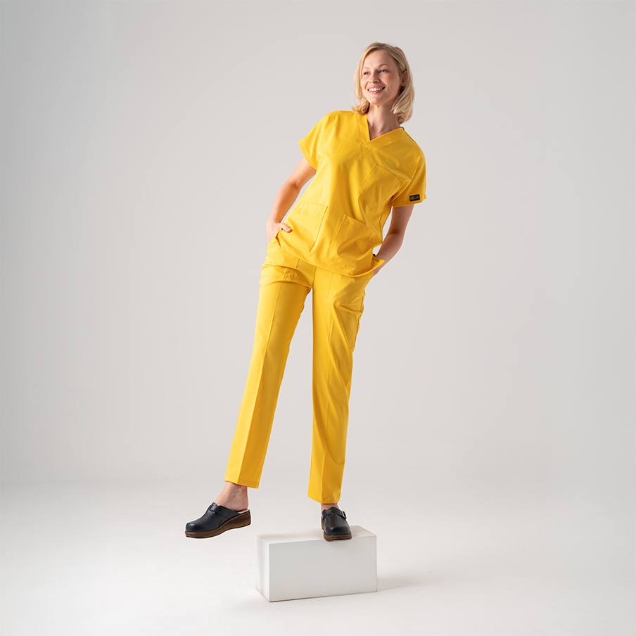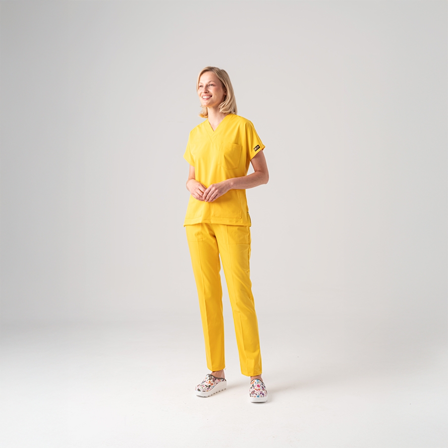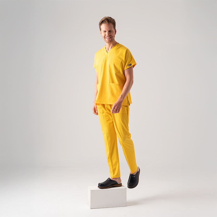 Yellow Dr. Greys Doctor Nurse Medical Scrubs Set Best Lycra Fabric is a surgical scrub set specially designed for the comfort of healthcare professionals. It consists of a V-neck, batwing sleeve top and elastic waist pants. It is suitable for intense work tempos with its non-sweating fabric structure and functional pockets.