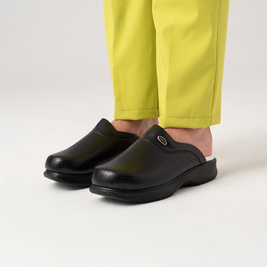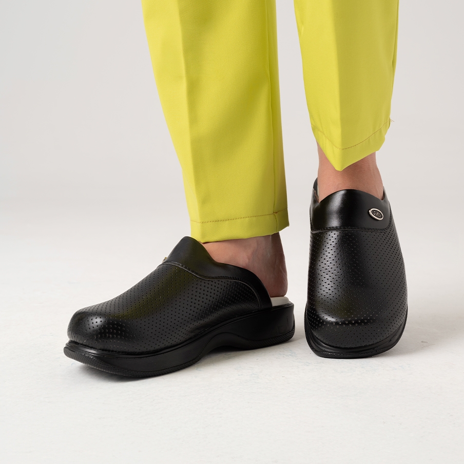 Siyah Kadın Doktor Hemşire Medikal Klasik Delikli Sabo Terlik, sağlık çalışanları için özel olarak tasarlanmış delikli sabo terliktir. Ortopedik 5 nokta tasarımıyla ayak konforu sağlar ve poliüretan taban yapısıyla dayanıklıdır.