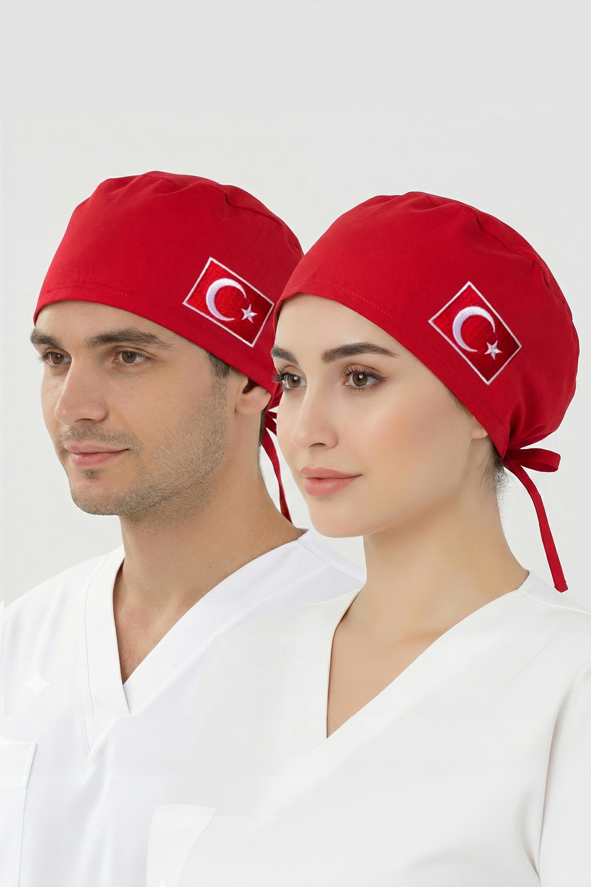Kumaş Tipi: Terikoton İnce, Ürün Grubu: Bone, Desen Tipi: Nakışlı, Desen seçiniz: Türkiye -Kırmızı
